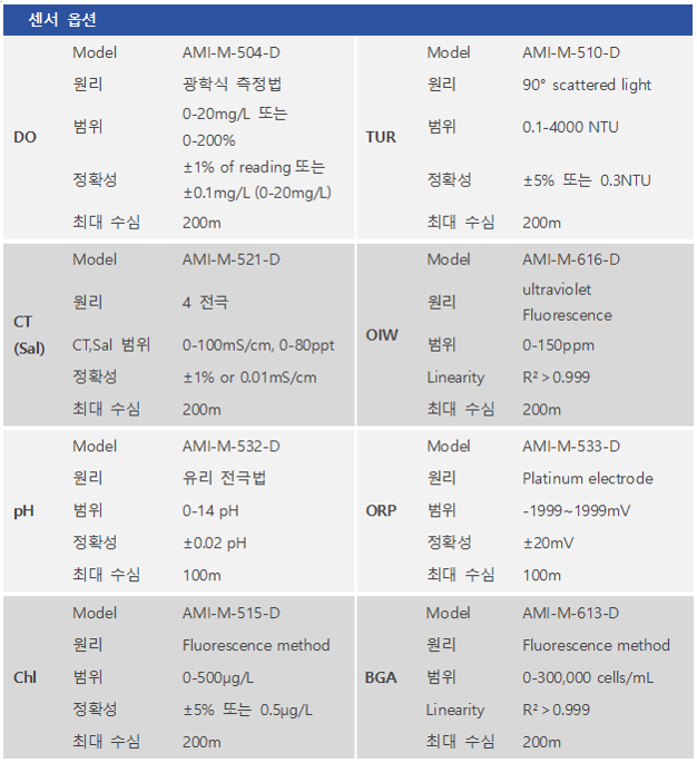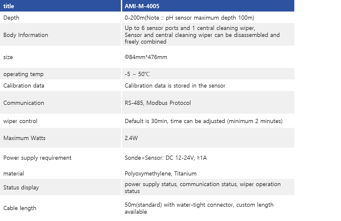 AMI-M-4005 is designed with robust pressure-resistant structure and self-developed Titanium alloy waterproof connector and is designed for deep water/well, marine and other working conditions. Up to 6 sensors can be connected simultaneously, and you can freely select Dissolved oxygen, pH, ORP, Conductivity(Salinity), Turbidity, Chlorophyll, BGA, and Oil measurement sensors. The sensors are all made of titanium alloy and have excellent corrosion resistance.