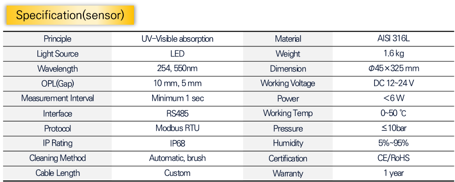 Compared to analytical devices, Online Spectrophotometer can measure without using reagents, so the generation of additional contaminants is low. The LED light source can be used for a long time, reducing maintenance costs, and automatic cleaning brush operation extends the sensor maintenance cycle and enables long-term online monitoring.