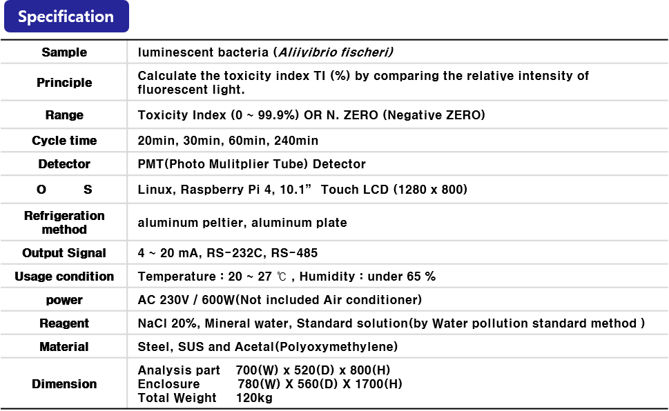 [ECO::WATCH TOXi] ECO::WATCH TOXi is based on “Water pollution standard method ES04706.1, Acute Toxicity Test Method Using luminescent Bacteria” and uses luminescent bacteria (Aliivibrio fischeri) to indicate abnormal changes in water quality as luminescence inhibition. It is a toxicity monitoring device that automatically inhales a sample, reacts it by contacting it with luminescent bacteria, and then calculates the ecotoxicity index (TOX Index,%) according to the change in the amount of luminescence to measure the inflow of toxic pollutants into the water system.