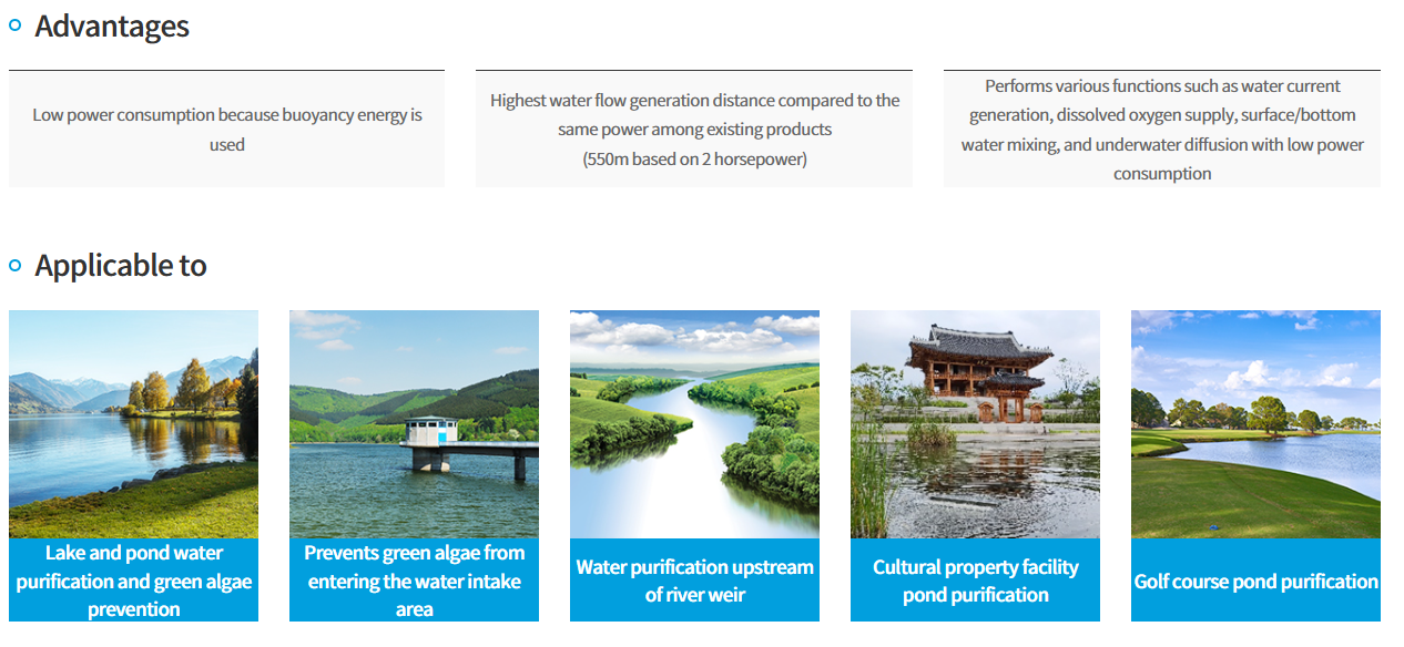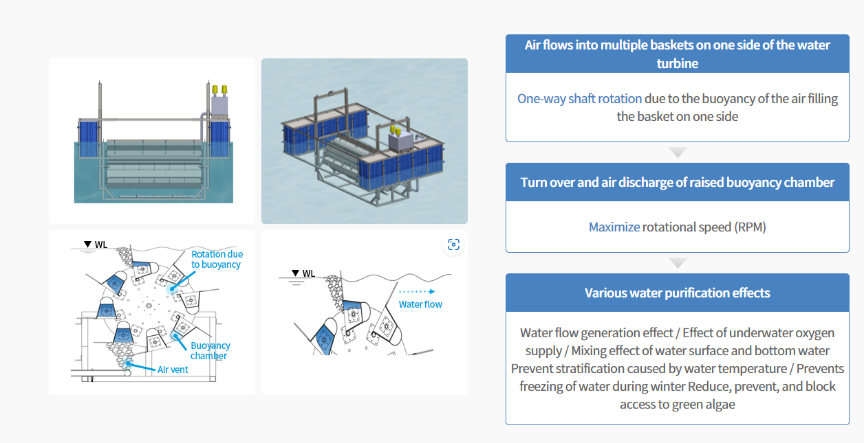 A water current generator that operates based on buoyancy water, The powerful rotational force generated by the buoyancy force generated by the injection of compressed air generated at low power This is a device that simultaneously prevents green algae and purifies water by rotating the handle underwater.